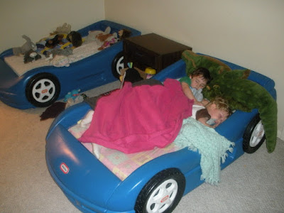 (This is where I planned to put a cute picture of two little sleeping drivers crammed into one little racecar, while the other racecar bed is across the room, looking very neglected, but I can't figure out how to post pictures here. So just imagine it. It's really cute.)